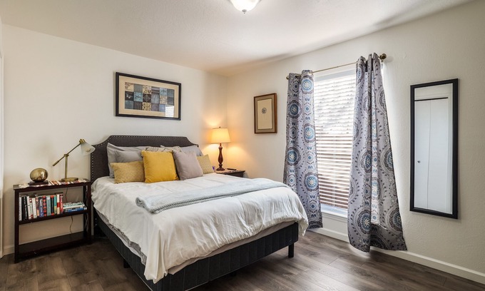 The luxurious master bedroom is equipped with a queen-sized high-end comfortable mattress, high quality bed linens, and comforters for a blissful nights sleep. A small reading library is provided along with a big screen TV equipped with a ROKU stick to stream all of your favorite subscriptions. More than enough closet space and luggage racks are provided for your convenience. The completely updated master bath has a shower and plenty of counter space.