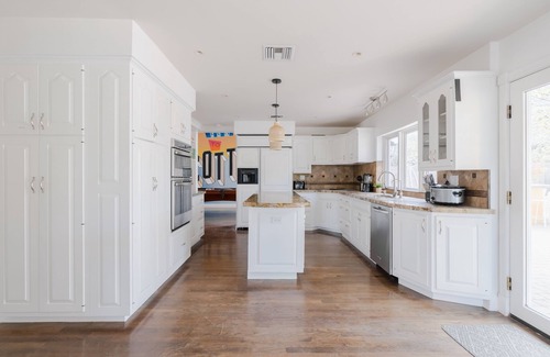 5 bedrooms, 3 baths. Amazing backyard - perfect for entertaining! Hot tub seats 8 comfortably. Pool with diving board (no safety gates), grill with bar, fire pit outside, outdoor seating, fun for kids. Granite, wood floors, fireplace, french doors, washer/ dryer. Secret garden. The pool, yard, & garden are lit at night. 4 smart TVs. Super clean - feels like a hotel home.