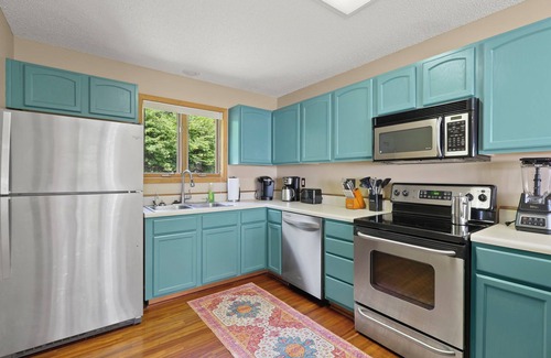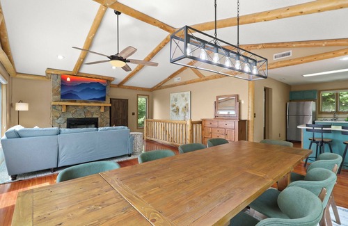 The warm and inviting living area is the heart of the home, featuring a plush sectional sofa and a comfy futon, perfect for curling up by the fire after a day of outdoor fun. High-speed WiFi keeps you connected, while the fully equipped kitchen makes home-cooked meals a breeze.