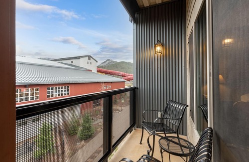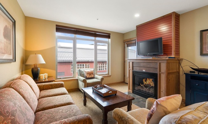 - Large Studio Condo with Full Kitchen Ski NOW Beautiful Balcony Views Hottub Fireplace