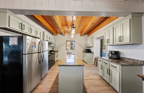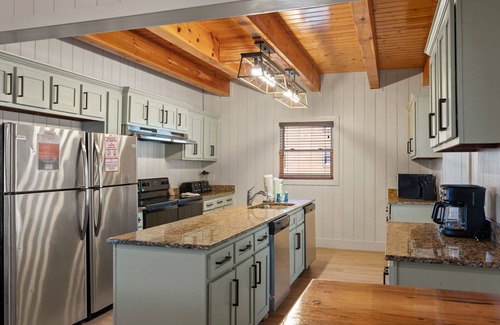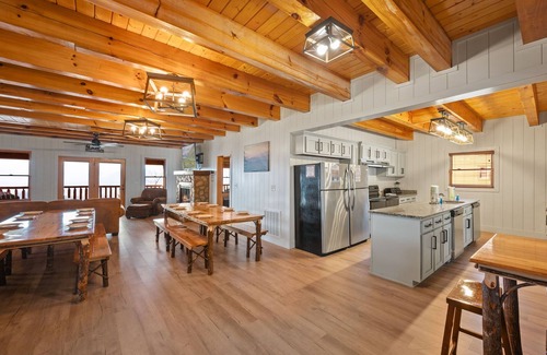 This luxurious lodge features 11 king-size bedrooms, each equipped with its own private bathroom, plus a unique bunkroom that comfortably sleeps additional guests. You’ll find ample amenities such as a fully equipped kitchen with dual appliances, perfect for culinary adventures, and inviting living spaces including game rooms with arcade favorites and theater-style seating. The outdoor areas boast two bubbling hot tubs, rocking chairs on covered porches, and a charcoal BBQ grill—ideal for festive gatherings or post-wedding relaxation under the stars.