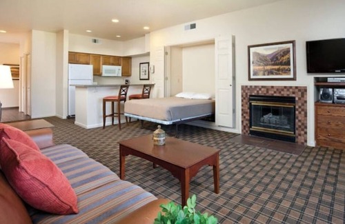 This spacious one-bedroom resort suite measures approximately 856 square feet. You will enjoy a king bed in the master bedroom, and a queen Murphy bed in the living room. Additional amenities include a full kitchen, dining area, fireplace, and balcony with a barbecue grill. Maximum occupancy is four.