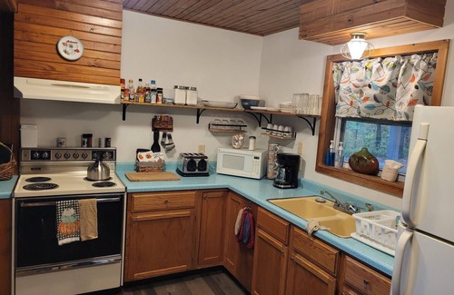 The cottage is located on a gravel road about a mile off the state highway. While not far off the highway, it is about a mile up a county road which may have some potholes and such due to weather between gradings. A higher clearance vehicle is recommended. Most vehicles do fine, just take it easy, it is not far. There is a doorbell camera pointing towards the driveway. No other cameras are on the property.