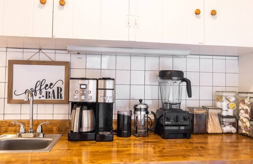 - Kitchen includes fridge, range, dishwasher, microwave, dishes, glassware, blender, coffee maker (drip, single serve, french press, coffee grinder), toaster, spices.