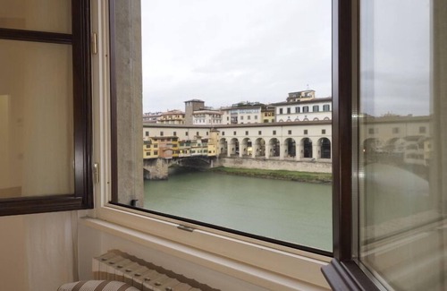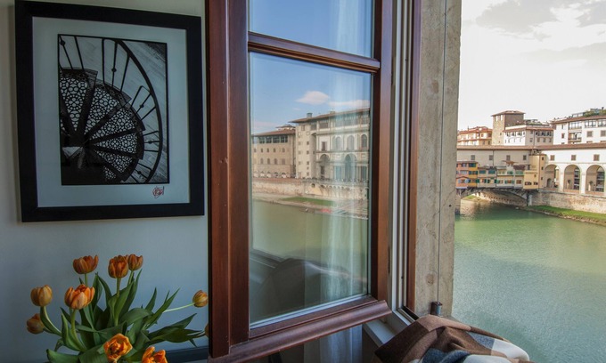 The apartment is 60 meters from the Ponte Vecchio or Old Bridge, one of the most famous Florentine landmarks, and looks directly onto the river Arno. On the opposite bank of the river is the Uffizi museum complex and the famous Vasari Corridor, which connects the Palazzo Vecchio to the Uffizi and across the Ponte Vecchio to the Pitti Palace.