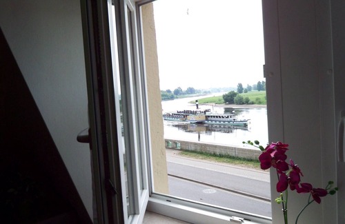Comfortable vacation apartment on the 1st floor of the vacation home Ambiente on the Elbe, located directly on the Elbe and Elbe cycle path with a view of the Elbe and the old town and good connections to the freeway, Dresden's old town and trade fair.