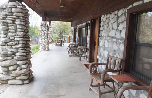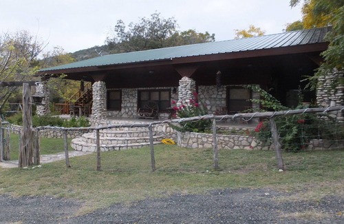 A beautiful rock lodge with wide porch overlooking Bullhead Creek. This property is not near Leakey or the Frio, but instead is 20 miles from Camp Wood in the upper Nueces River Basin. Kayaking and tubing are available on the Nueces River and rental equipment is available in Camp Wood. This property is private, no neighbors and pristine in beauty. The lodge features a full kitchen with ice maker, a bedroom and bath with queen size bed, second bedroom with double bed, large sleeping porch with two twin beds, trundle bed and queen sleeper sofa. . Large patio, fire pit, propane barbecue pit, TV in large living/dining area, WiFi and a land line for local calls. This is a remote end of the road ranch, where peace and solitude reign. There are game blinds near feeders so that wild life viewing is available for photo opportunities. Fishing in the clear spring-fed creek is allowed, catch and release. The water is so clear that you can see the fish swimming to your bait or lure. Swimming is refreshing in a deep hole with rock steps. Hiking is encouraged. Exotic game roams the ranch as well as native species. Aoudad sheep from Africa, Axis deer from India, elk, Sika deer, fallow deer in addition to white tail deer, turkey, wild hogs, skunks, porcupines and many others. Bird life is abundant.