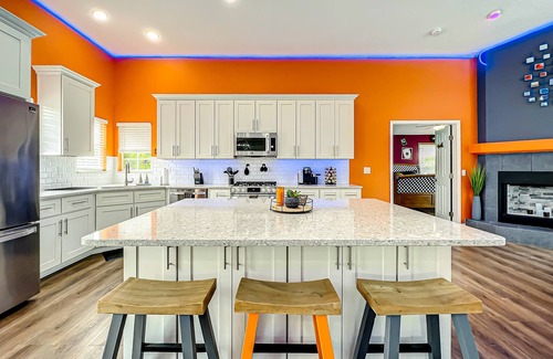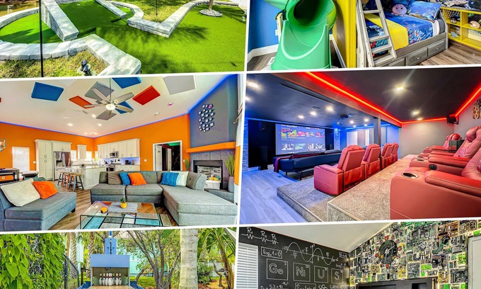 Step inside to discover 13' vaulted ceilings that lend an open, airy charm to the space. The house features six enchanting rooms, each uniquely designed to cater to various themes. Marvel at the Alice In Wonderland-themed master bedroom with a luxurious sleigh king bed and ensuite bathroom, or opt for the mad scientist & technology-themed king bedroom. Kids will adore the bunk rooms, one with an Underwater theme and the other with a Space theme, complete with full-over-twin bunk beds and spiral slides. Movie nights will never be the same in the spacious home theater, equipped with a 4k cinema projector, 7.14 Dolby Atmos surround sound, and plush seating for 14, including two king beds.