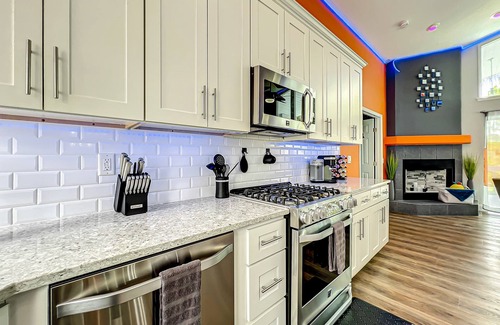 Every aspect of your stay has been meticulously curated to ensure a five-star experience. Our rooms boast posturepedic memory foam mattresses, accompanied by deluxe linens for your comfort. LED accent lighting adds a touch of sophistication, both inside and outside the property, setting the perfect ambiance for your unforgettable fun getaway. Other amenities include new dual central air conditioners, 500MB/s fiber-optic wireless internet throughout the property, coffee/tea maker, luxury bath and beach towels, washer & dryer, hair dryers in bathrooms, 5 Roku smart TVs, a fully equipped kitchen with premium stainless steel appliances, garage with several bicycles for free-use, and a private driveway parking for up to six vehicles.