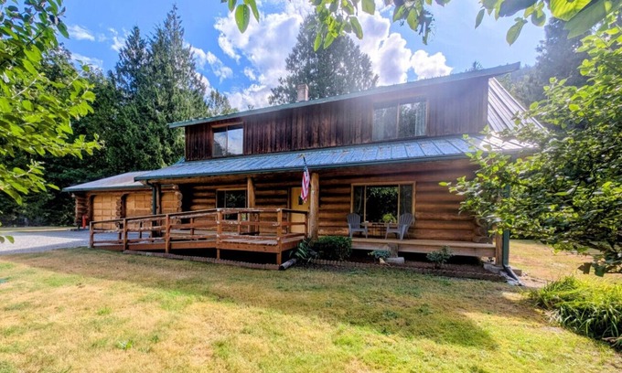 Cozy up in this spacious log home right on the Skagit River, just minutes to the North Cascades National Park! Pups are welcome and there are plenty of amenities for children to enjoy. This 5 bedroom home is ideal for large groups who want to bask in nature, whether it's in the national park or right in the backyard! It features an open concept living space, main floor bedroom & full bathroom, 4 bedrooms & full bathroom upstairs, huge game room, hot tub, BBQ, firepit, great wifi, & EV charger.