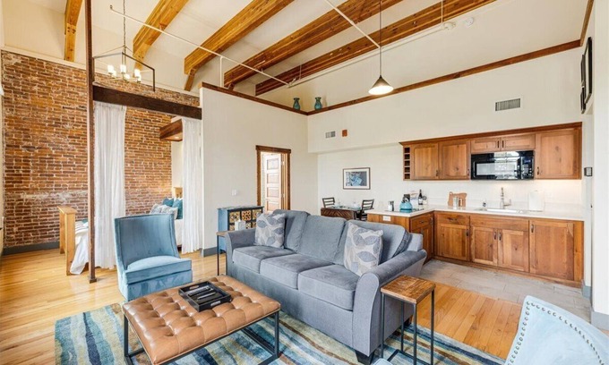 The Jory Flat includes a semi-private bedroom with a queen bed with its own large window on the east wall, with exposed antique brick on the south wall. The living room sofa converts to a double bed to sleep two more, and a rollaway bed may be added to sleep a total of five. The bathroom enjoys natural light from a window on the south wall and features an antique, clawfoot bathtub next to a modern, walk-in shower enclosed by glass bricks.