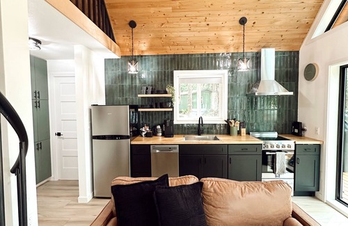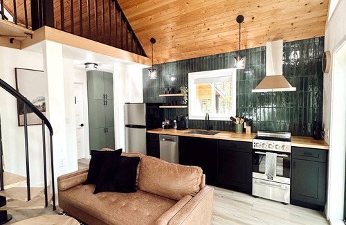 This 600 sq ft cabin is modern and functional. The area is open and inviting with large windows that allow for natural light to illuminate the space. The French doors opens to a spacious front deck for all your relaxing or entertaining needs.