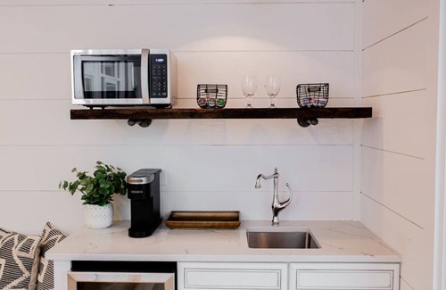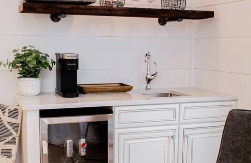 Whether you are extending your stay from attending an event at The Artisan, seeking a romantic remote destination getaway, or getting a group together for the weekend to experience the many activities in the area, the tiny homes have it all and more. Drawing inspiration from our rich French country heritage, these luxurious suites are sure to impress! Features include white planked oak floors, shiplap walls, white marble tiled bathrooms, floor to ceiling windows with flowing curtains, pops of color and charming chic décor throughout. Accommodating up to 17 guests across all 5 tiny homes, you will have your chose of four romantic 1-bedroom suites or one large two-story that sleeps 9 comfortably. Each home has its very own on suite with wet bar, refrigerator, Keurig, and microwave. Sneak away as two for the weekend or rent out all the tiny homes for an intimate weekend among friends and family. There is not a detail forgotten! The farm is your perfect place to stay. Book your tiny home today!