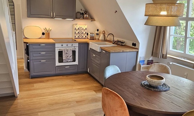 Bright, stylishly furnished apartment with individual layout and high-quality furnishings. Fully equipped kitchen with dishwasher and retro fridge, modern daylight bathroom. Cozy retreats, plenty of storage space. The garden offers seating, barbecue facilities, sandpit, swing and a private beach chair. The photos show the status as of May 2025 - further fixtures and fittings have been added since then.