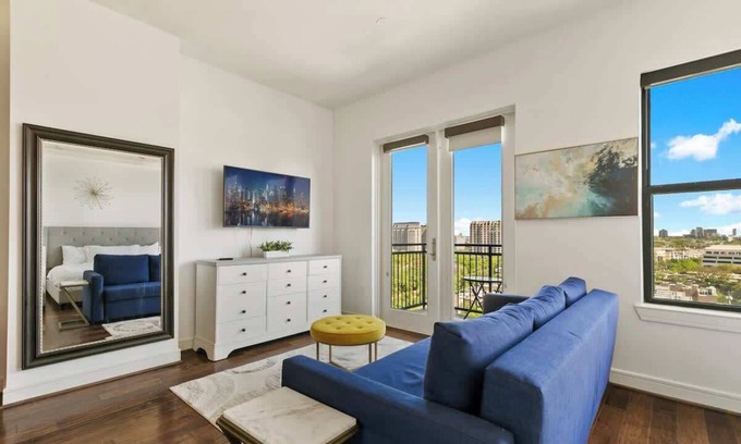 This Luxury Studio apartment is perfect for a solo/business traveler or small group exploring Dallas for extended periods or relocating. The apt and amenities are designed for an ultimate experience. Features comfortable beds, fully equipped kitchen and more. Experience Dallas With Us!