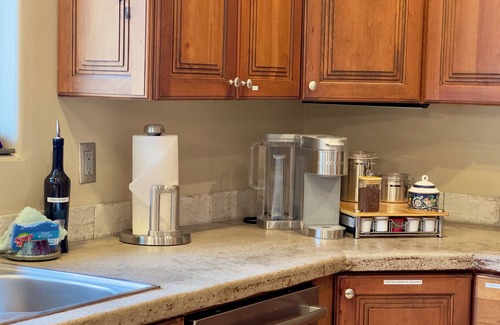 There is a full size kitchen with custom cabinets & concrete countertops. We keep it stocked with everything you'll need to cook those big group meals! Plenty of dishes, silverware, basic spices, glasses, cups, baking sheets, pots and pans, mixing bowls, tea kettle, coffee maker (x2), slow cooker, rice cooker, ice maker, dish soap, plenty of dish towels and scrubbers, etc.! Also worth a mention that there is a R.O. water tap in the kitchen sink. Don't forget those refillable water bottles folks!