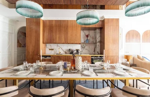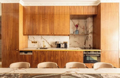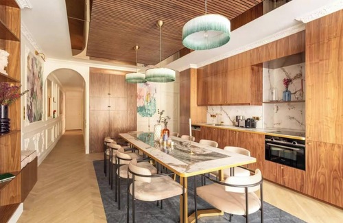 Experience the charm and elegance of Paris with this beautifully renovated 4-bedroom apartment, ideally located between the Louvre Museum and the Opéra Garnier. Nestled in one of the city's most prestigious neighborhoods, this apartment offers an authentic Parisian stay with easy access to renowned landmarks, luxury boutiques, and cultural attractions. The apartment features a bright and airy living room bathed in natural light, offering a welcoming atmosphere with a touch of powder pink and sophisticated woodwork. A modern, fully stocked kitchen is perfect for preparing meals and entertaining, while a spacious dining room provides ample seating for up to ten guests, making it ideal for gatherings.
