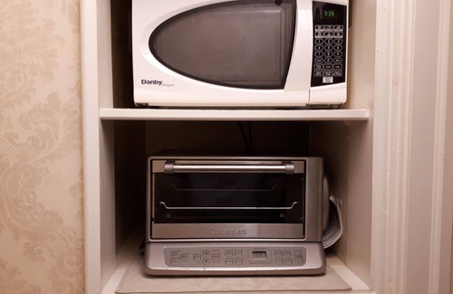 You will enjoy a lovely, large, comfortable suite with a self-contained kitchenette which includes a fridge, food storage and prep areas, microwave, toaster/convection oven, induction hot plate, air fryer, french press coffee maker, tea, coffee, all pots and pans, utensils, etc for light cooking. The suite has a French bedroom set with a queen size bed and a Tempurpedic memory foam mattress with top quality bedding, just perfect for falling asleep to the sound of the waterfalls outside your window. Toiletries, bath robes and towels are provided. The Suite has antiques, oak floors, carpeting and hand sewn silk lampshades and a Juliette balcony. There is a flat screen Roku TV on a swivel with Netflix and Prime.
