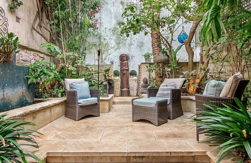 Split over 3 levels, the ground floor consists of the living room, dining room, atrium, large kitchen and sitting area, opening onto a shady, cool, serene courtyard. Upstairs, you ll find 4 bedrooms, all with their own balcony, three rooms with queen sized beds on the first floor, and one bedroom in the attic with queen size bed. There are two bathrooms located on the first level as well.