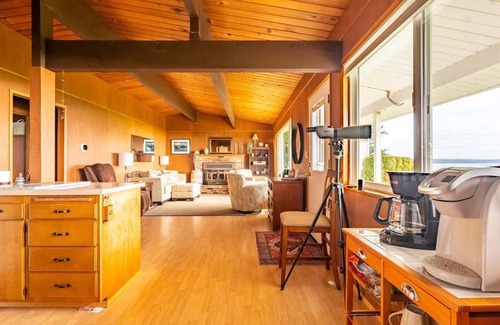 The main living room which overlooks the water is a calming blend of serenity and amazement. Settle into the cozy sofa or relax on the recliner or rotating side chairs. Grab a blanket and cup of coffee and enjoy the views! Additionally, we have a TV room that has a Samsung Frame with the daybed. Bring a good book out to the back and relax in one of the lounge chairs, or use the telescope to look for birds and wildlife.