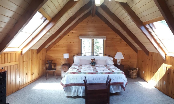 Ledgewood Cottage's upper level holds the second master bedroom, a spacious relaxing sleep loft with king bed, two skylights, and view across the great room to treetops and sky. The lower level of the house holds the fourth bedroom, with four-poster queen bed and private outside entrance.