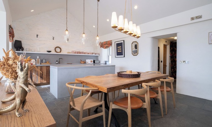 The space has been designed with high end finishes. You immediately relax on arrival, sink into the sofa or sit on the window seat and take in the view. A unique chefs kitchen, dining space perfect to sit and eat while looking out at the sea. Open fireplace and heated stone floor finishes that replicate an old world cottage but with every contemporary convenience.