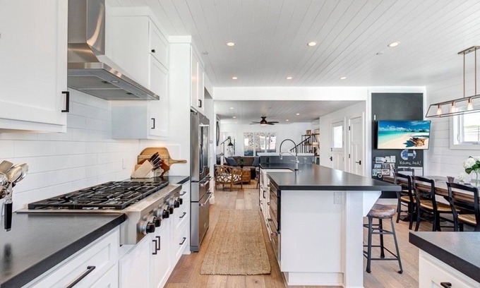 - Fully stocked for meal prep and serving: high-end dishes, utensils, cookware, bakeware