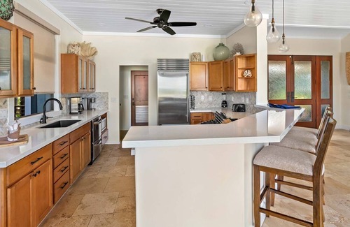 Surrounded by lava rock walls on three sides with an entry gate, one feels tucked away in an island paradise. The spacious living areas offer ocean views from almost every room. The full equipped gourmet kitchen features Sub Zero and Wolf appliances. There are two master suites, as well as an additional two guest rooms, all offering ocean views.