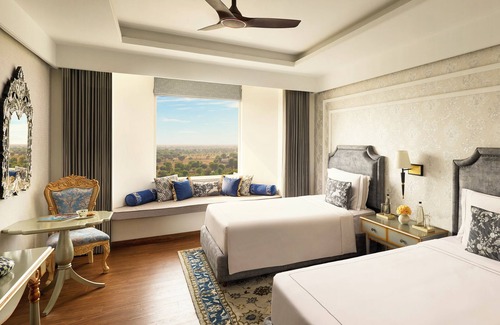 Anantara Jewel Bagh Jaipur offers 150 air-conditioned accommodations with minibars and espresso makers. Beds feature down comforters and premium bedding. 55-inch LED televisions come with premium digital channels. Bathrooms include bathrobes, slippers, bidets, and complimentary toiletries.