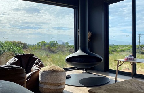The living space is a haven of comfort and relaxation. A teardrop fireplace, available from May to September, creates a warm and inviting ambience, enhanced by dimmable lighting for cozy evenings. Year-round comfort is assured with a reverse-cycle heat pump for cooler nights and air conditioning for warm summer days.