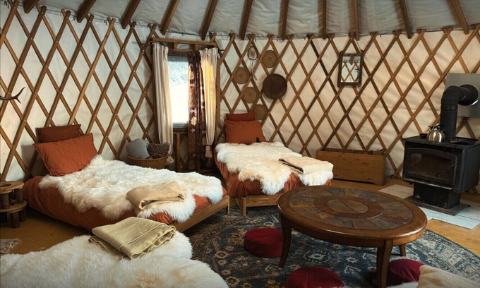 Experience our gardens in this Mongolian dwelling, thoughtfully set on the grounds of our beautifully preserved 1898 Victorian manor. This spacious Ger (true name of a Yurt) features four single beds with authentic sheepskins (additional mattresses available), a cozy woodstove, and a fridge for your essentials.