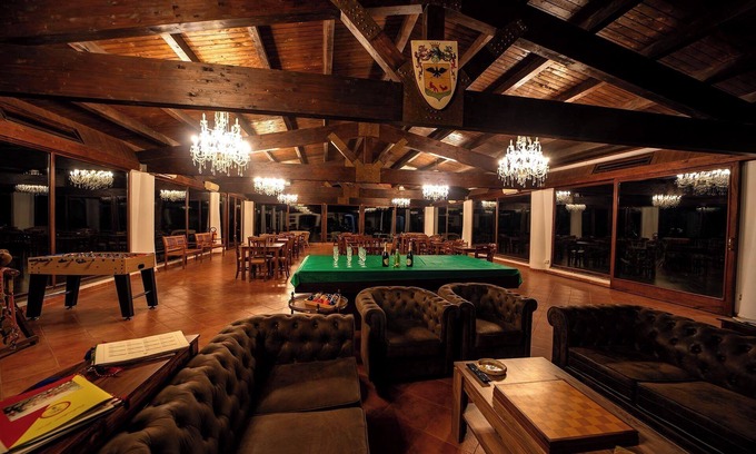 In the large living room with many tables for dining, in addition to the relaxation area with fireplace, TV and sofas, there is a games corner with billiards, table football and ping pong.