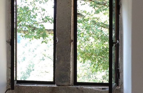 The house is built on a mountainside, surrounded by oaks and white oaks. The entrance leads on the one hand the old hermitage, on the other hand the new part. In the new extension (level 'high', that of the entrance), 2 bedrooms, bathroom and separate toilet. In the old house, on the same level, a large all white and vaulted kitchen and a living room. At the bottom level of the house, a dormitory for children (also vaulted), bathroom, separate toilet and a small extension connected to the house, a room. Everything is laid out with care and simplicity. Old dark wood furniture, and other more contemporary. New bedding. Many white touches of color.