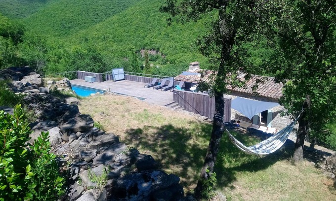 The house is surrounded by terraces (bancels Cevennes). Above the extension is located the pool, extended by a large exotic wood deck. The view is magnificent.