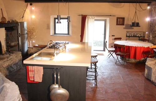 To the”Ai Torchi Vecchi”(the meaning of the name of this place is:”to the old presses”)is one of the most striking corners which is in the valley of the river Rosaro in Lunigiana,in the north-west part of Tuscany.It is perhaps the most ancient mill system,how one immagines from the very beautiful pedestrian bridge of medieval origin,all made of stone which crosses the river and separates it still from the nearby village of Posara.On the property the water-level mark and the tracks of where the water used to run under the mill are still very visible. The complex included three adjacent mills,at present one af them has been restructured and changed into a two-floor habitation of about 500 mq.On the ground floor is a large kitchen with fire-place,living room,dining room and one bathroom and small gym. You can still find the ancient handmade stone presses now integrated in the furnishing and all of this really creates a very special place. From an internal stair one accesses the upper floor which also has its own separate entrance with five bedrooms each with private en-suite bathroom with shower or bath tube. The outside area is just in front of the river and is equipped with barbecue,sink,table and benches for eating. Behind the house is a swimming-pool, 12x5m, with deckchairs, sunbeds and changing room. The parking for 3 cars is shaded and has charging for electric cars. A large circular hearth with seating is ideal for staying around the fire for an aperitif or simply for gazing at the starry sky or warming up after a night swim in the pool. Immersed in the greenery with just the sound of the river, isolated,it is very cool in the summer period.”Ai Torchi Vecchi” is the ideal place for lovers of nature and tranquillity.