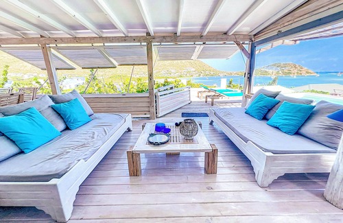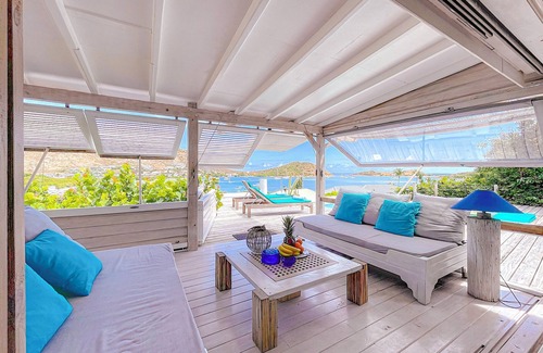 The Villa Ancre Bleue is a charming wooden house offering spectacular views of Cul-de-Sac Bay, Pinel Island.