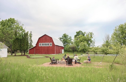 Outside, a private patio and fire pit offer an ideal setting for intimate gatherings.