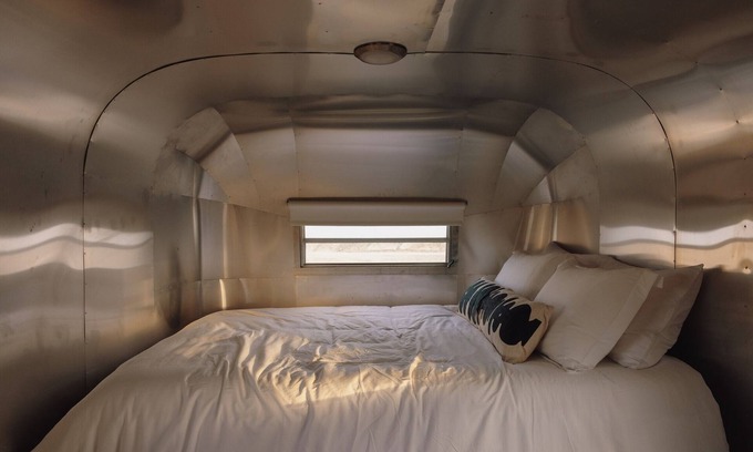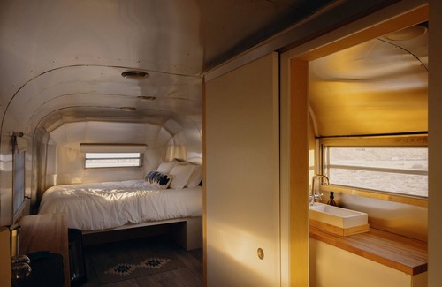 Andros is a newly updated vintage trailer at Desert Reef with modern amenities. Andros has a private bathroom with access to the new bathhouse, and a queen bed that sleeps 2. All Airstreams have pour-over coffee stations. All Airstreams have heat and AC. This unit is not rent-able for towing. This property is not pet or smoke friendly.