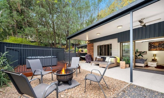 Cottage 1 opens onto an expansive verandah which runs the length of the Cottage, looking out onto a firepit and a 5 person spa, surrounded by beautiful Australian native plants and native birds.