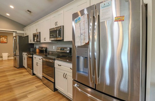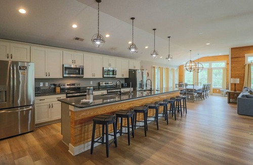 The top level features an open-concept kitchen equipped with two of everything — refrigerators, stoves, microwaves, and dishwashers — plus a butler's pantry with an additional refrigerator for all your drinks and beach snacks. Start the day at the oversized breakfast counter (seating for 8), then gather in the spacious dining area for memorable group meals.