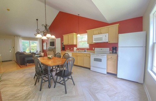 This beautiful 2 bedroom cottage sleeps 6. No stairs means easy access. King Suite has on suite bathroom. Second bedroom has a queen bed with a twin and trundle underneath.. There is a second bathroom for all guests to use. Fully stocked kitchen with charcoal grill outside. In the back there is a private patio with hot tub! This cottage is located in Edgewater resort. The resort has a pool , a playground, and public fire pits. Book your stay today!