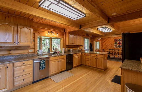 Whether you're planning a family trip, friends' getaway, or just some time to recharge, this place is made for relaxing. There's a huge open living area with a cozy fireplace and a big leather sectional perfect for movie nights on the 65" 4K smart TV. The kitchen is fully stocked with plenty of room for multiple cooks, every utensil you need, new appliances and both a Keurig and standard coffee maker for your morning brew. Enjoy your meal with friends and family around a custom-built wooden dining table that seats up to 10 people. There is another custom built large table outside on the deck for you to enjoy meals while taking in the serene mountain view.