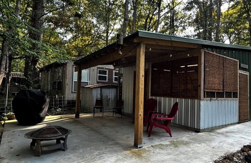 Nestled in the tranquil Sabine National Forest near Hemphill, this secluded fish camp offers the ultimate retreat for anglers and nature lovers seeking serenity. Tucked mid-lake in the back of a peaceful cove, this inviting mobile home provides complete tranquility. Equipped with heating, air conditioning, and complimentary Wi-Fi, this cozy haven features a comfortable bedroom with a full-size bed, a spacious living area with a queen sofa bed and full-size bunk beds, and a modern bathroom with a walk-in shower, stocked with essentials for a comfortable stay. Enjoy streaming your favorite shows on the smart TV by logging into your Netflix, Amazon, Disney, or other streaming service accounts. Cell phone service is available with our in-home cellular signal booster, though signal strength may vary by provider. Steps away, you’ll find a convenient laundry facility, a fully equipped screened outdoor kitchen with a BBQ grill, and a boathouse with a boat lift and fish cleaning station.