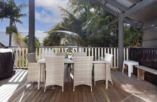 Climb the stairs and step into a tranquil hideaway where a generous timber deck, wrapped in lush tropical greenery, sets the tone for a restful escape. Ocean breezes dance through the treetops, and though nature's air conditioning is plentiful, the owners have thoughtfully installed modern comforts too.