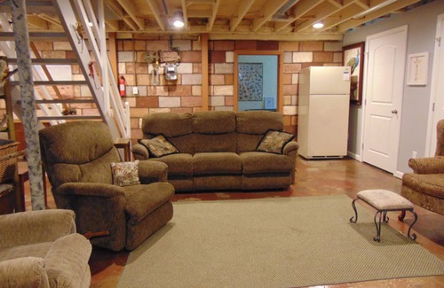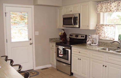One full bathroom upstairs and a full bathroom in lower level, both newly updated. Kitchen has granite counter tops, pots, pans, and everything you need right down to the spices! Washer and Dryer available in the lower level. All clean bedding and towels are provided. Central heating & Air conditioning for your comfort. WIFI for all, password is on the chalkboard.