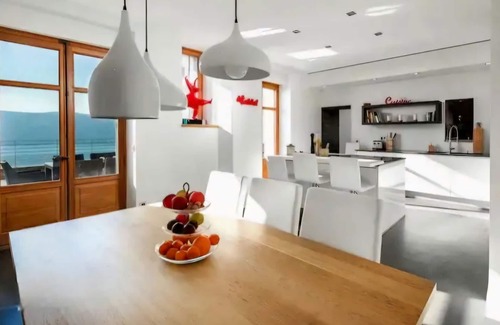 Modern open kitchen with central island and dining table opening onto the front terrace with lake view