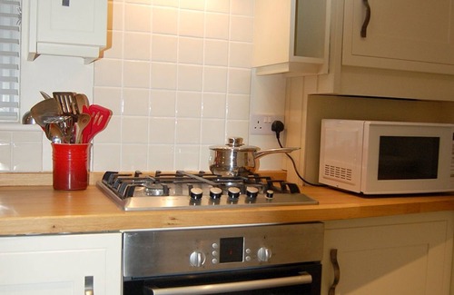 The kitchen area has a stunning newly fitted kitchen with cream ‘Shaker Style' fitted units, oak block wood worktops, and slate floor. It is equipped with everything you would expect in a premium holiday home kitchen.