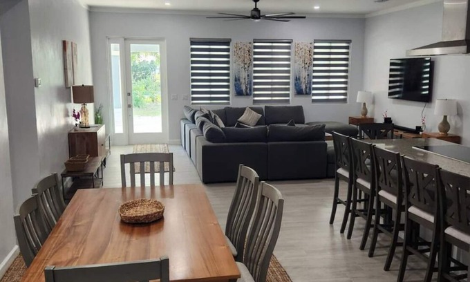Centrally located modern home in the heart of downtown Marsh Harbour. It is within walking distance to Great Harbour Club and Marina and to some of the island's most popular stores, restaurants, and bars. The house itself has an island charm, with cool colors themes, high ceilings and a office/ den. The home is very spacious and outfitted with modern appliances and décor.