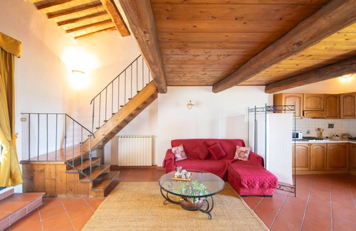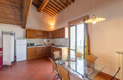 "Fienile", 3-room apartment 95 m2 on 2 levels, on the ground floor. Comfortable and rustic furnishings: living/dining room with 1 double sofabed and TV. 1 double bedroom with air conditioning. Open gallery with 1 double bed. Kitchenette (4 hot plates, dishwasher, toaster, kettle, microwave, freezer). Shower/bidet/WC. Terrace furniture. Very beautiful, of the countryside. Facilities: baby cot for up to 2 year olds (extra), hair dryer. Internet (WiFi, free). Suitable for families. Maximum 1 pet/ dog allowed. IT048033B5S2NHKPIG
