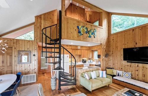 The cottage has two well-appointed bedrooms and two full bathrooms. Conveniently located on the main floor, the master bedroom features a luxurious king-size bed with plush linens. Accessible via a charming spiral staircase, the second bedroom offers a unique and cozy retreat. It features a full-over-queen bunk bed, providing comfortable sleeping arrangements for up to three people. The loft area includes a comfortable queen mattress, offering additional sleeping space perfect for extra guests or children. The property includes a heated gazebo, providing an extra sleeping area. This cozy space is perfect for those who want to feel closer to nature without sacrificing comfort. The spacious tiered deck features comfortable seating and a dining area, perfect for enjoying al fresco meals or a cookout on the gas grill, while taking in the stunning sunsets over the lake. For sunbathing and beach days, head to the gorgeous, secluded public beaches a few minutes away. The home DOES NOT have a private beach or association beach, but you can walk down to the water's edge via a private access path 200 yards from the house and stroll along the beach for miles in either direction. This is not a pet friendly property.